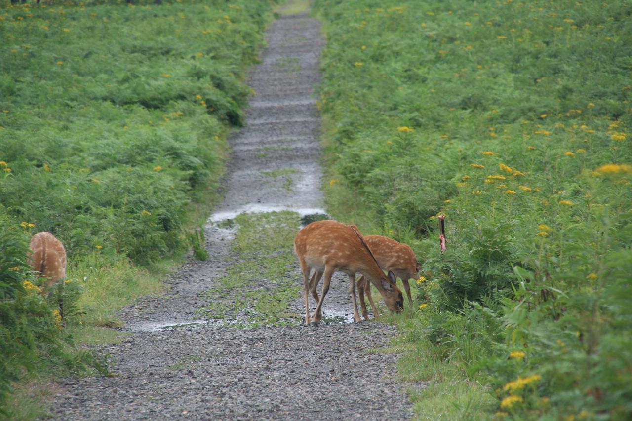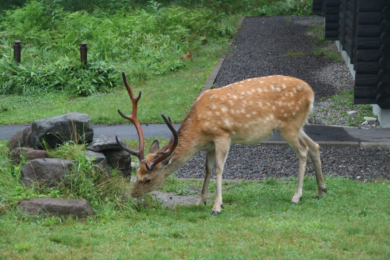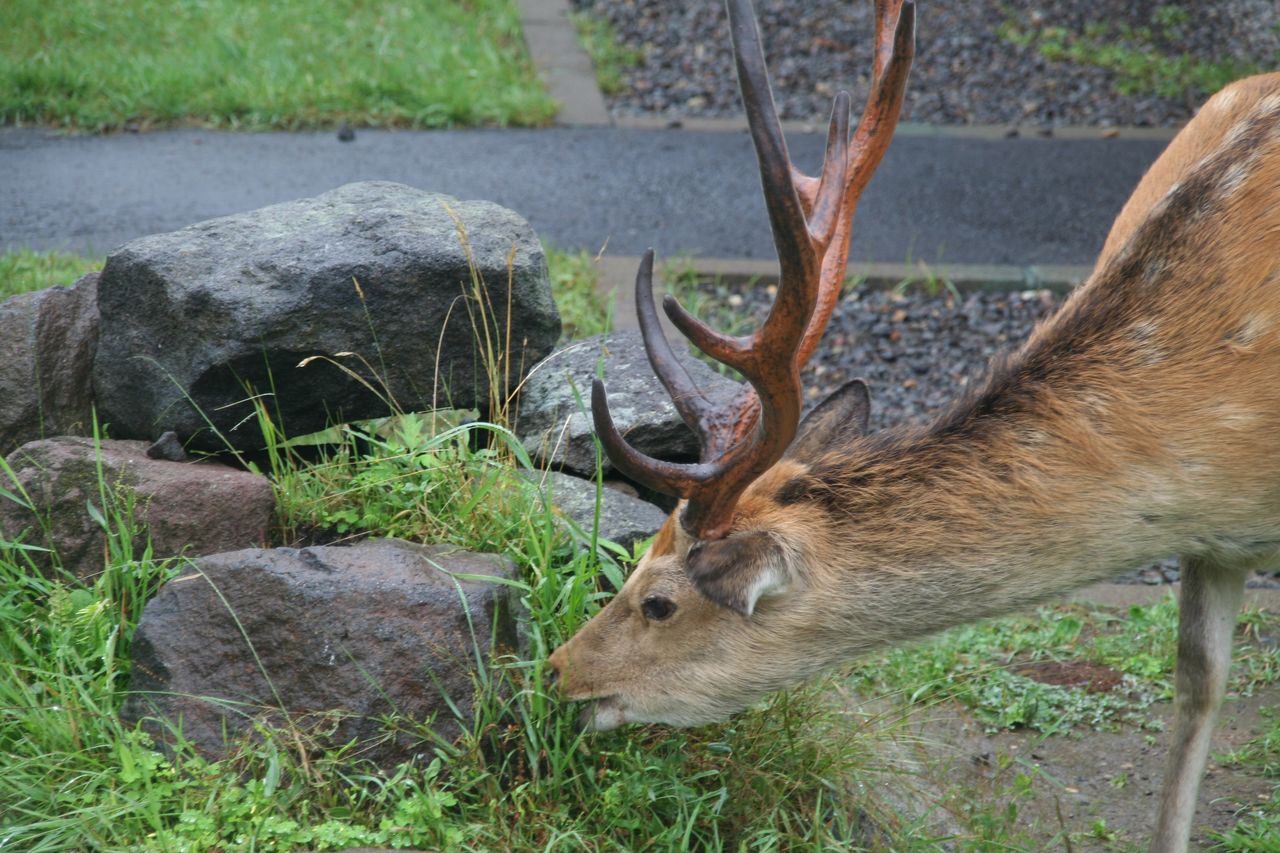 国立公園内では狩猟禁止なので、警戒心が薄いのか鹿も逃げずに草を食んでいます。