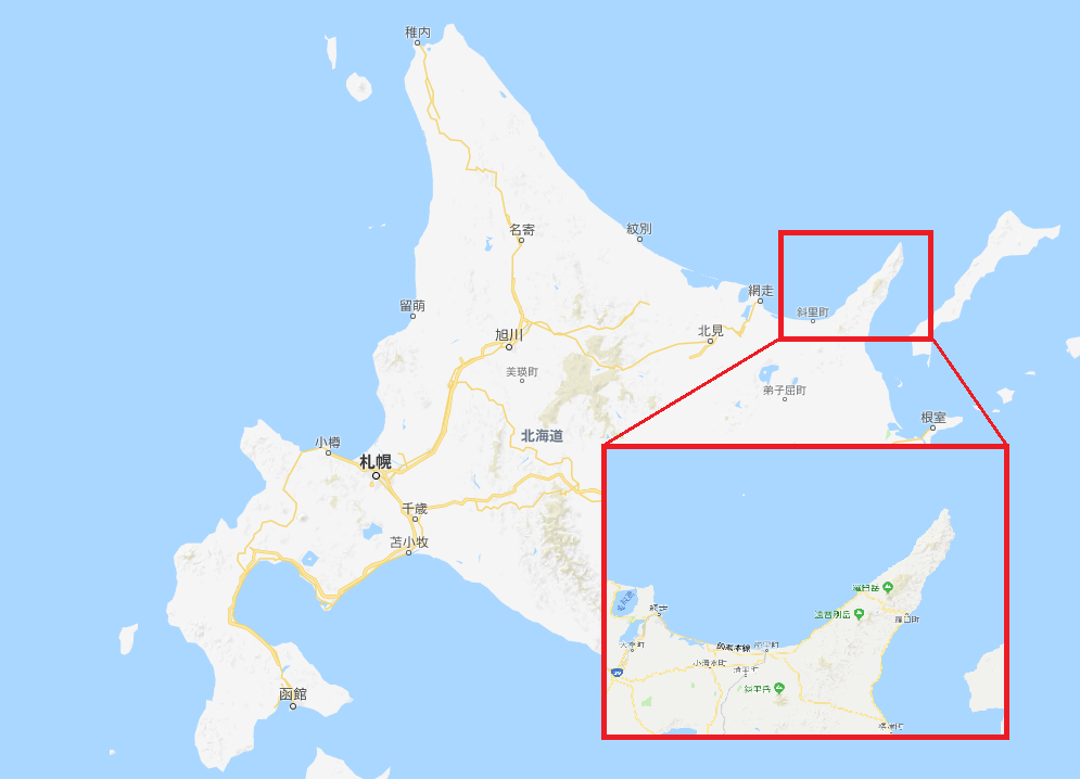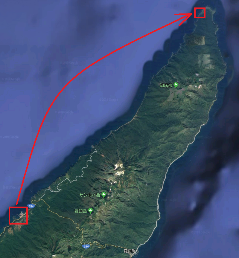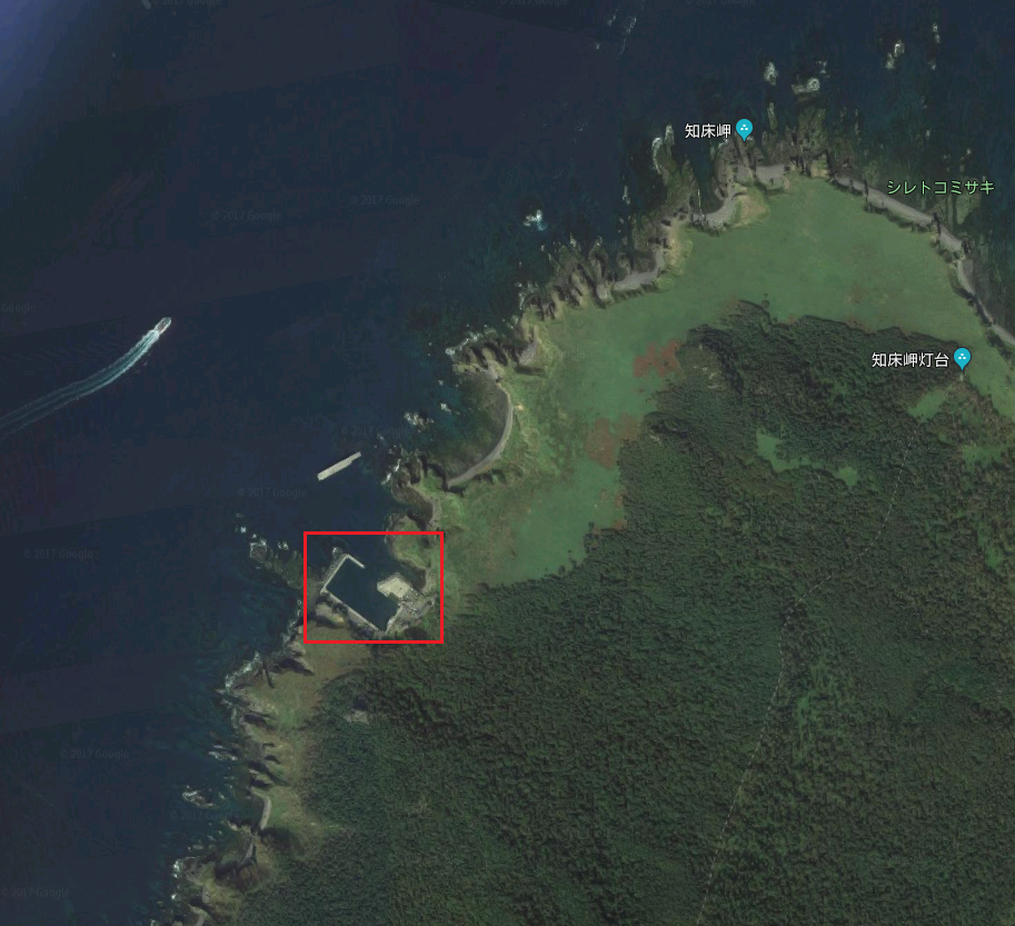 ↑左下の赤枠が知床の漁港で右上の赤枠が今回行った場所。