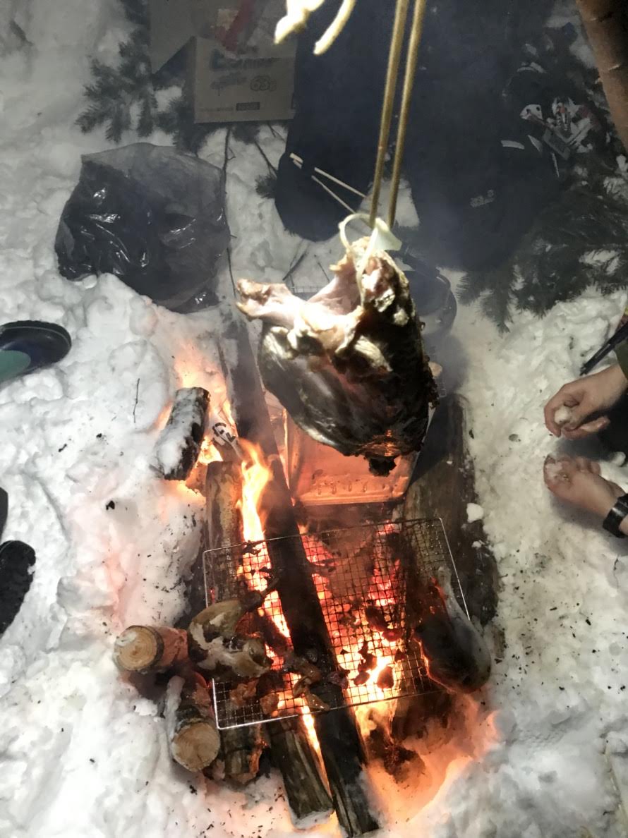 一斗缶を持って行ってたので、火を熾してその上にぶら下げ解凍していました。