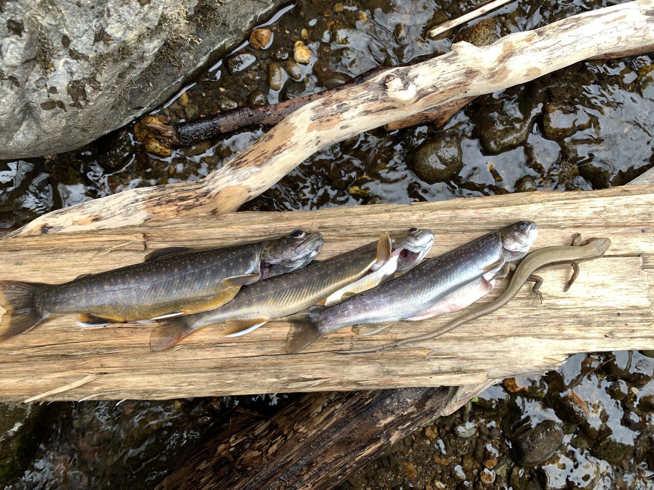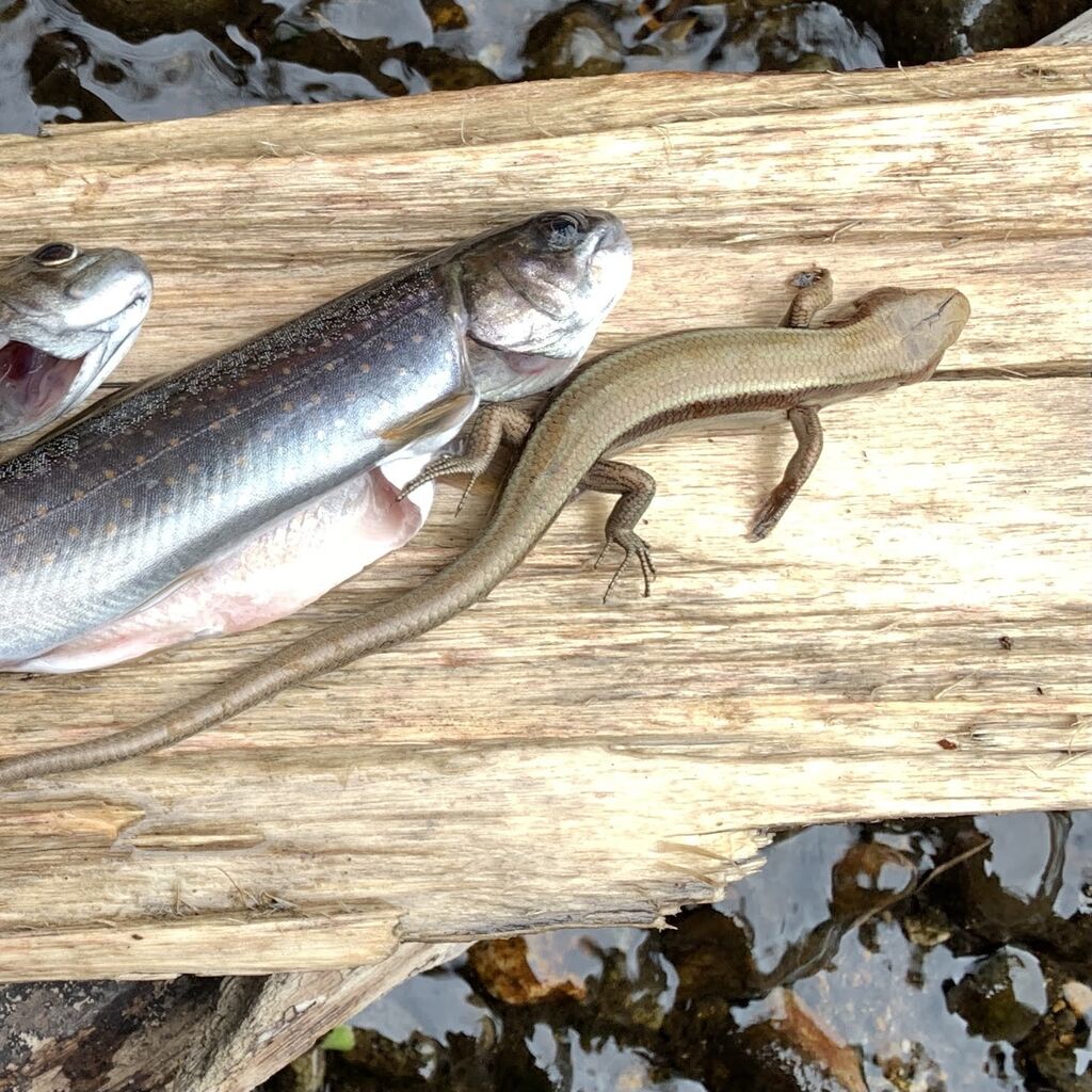写真左から、オショロコマ3匹ヒガシニホントカゲ1匹です。