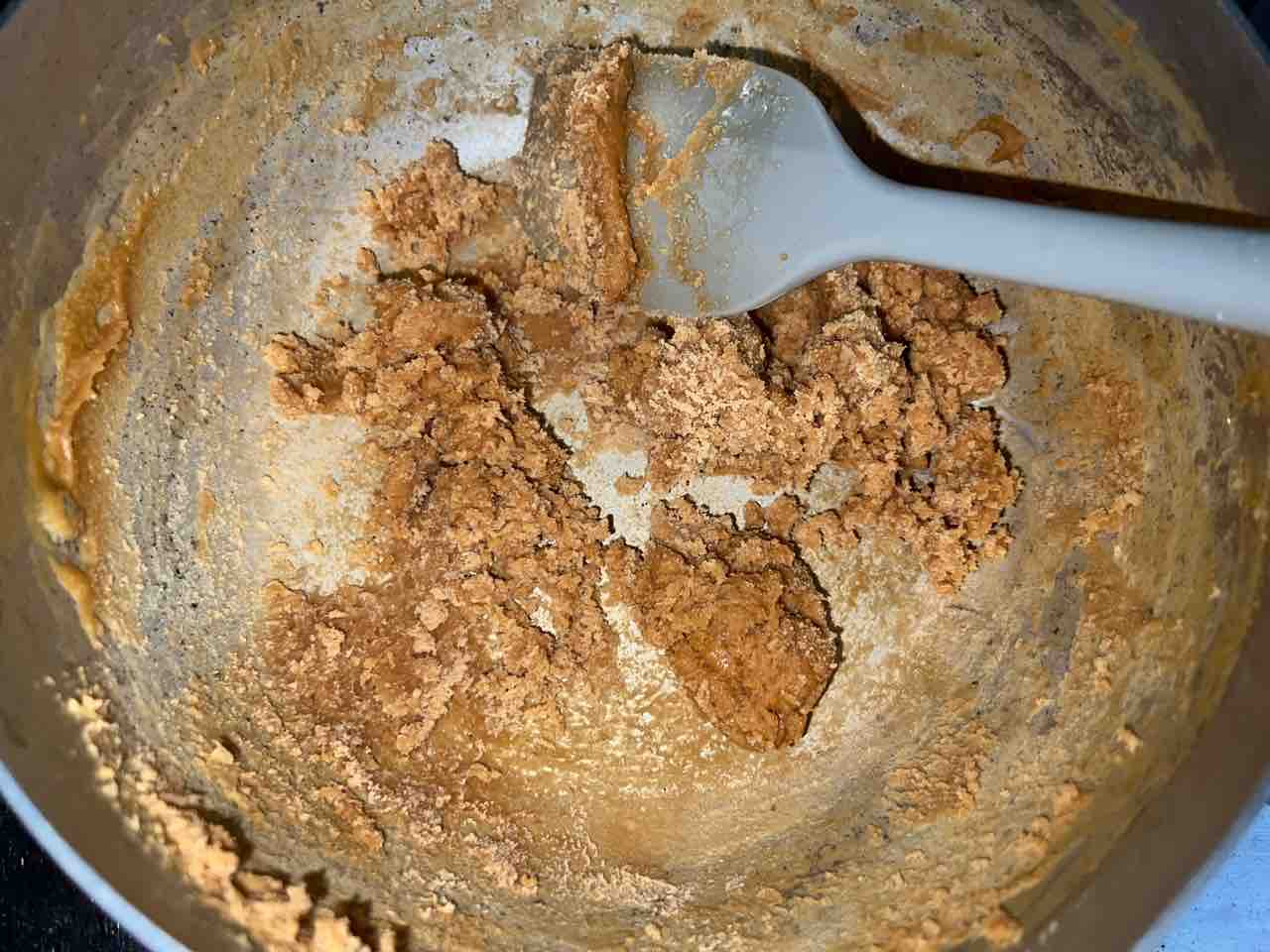 固まってしまったら、木べらなどで崩しながら混ぜ続けましょう。