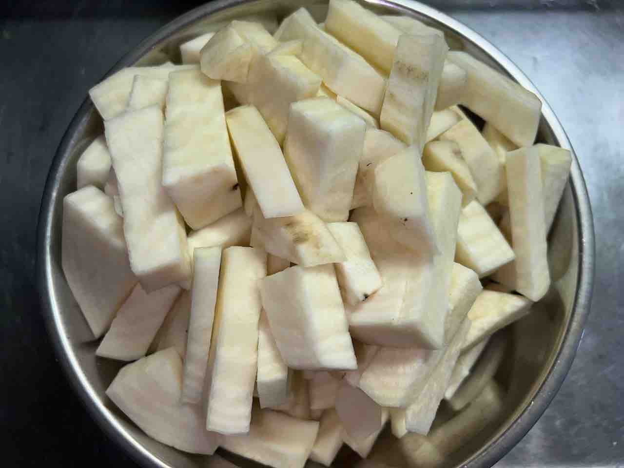 短冊状に切る → 柔らかくなるまで煮る → 粉砕