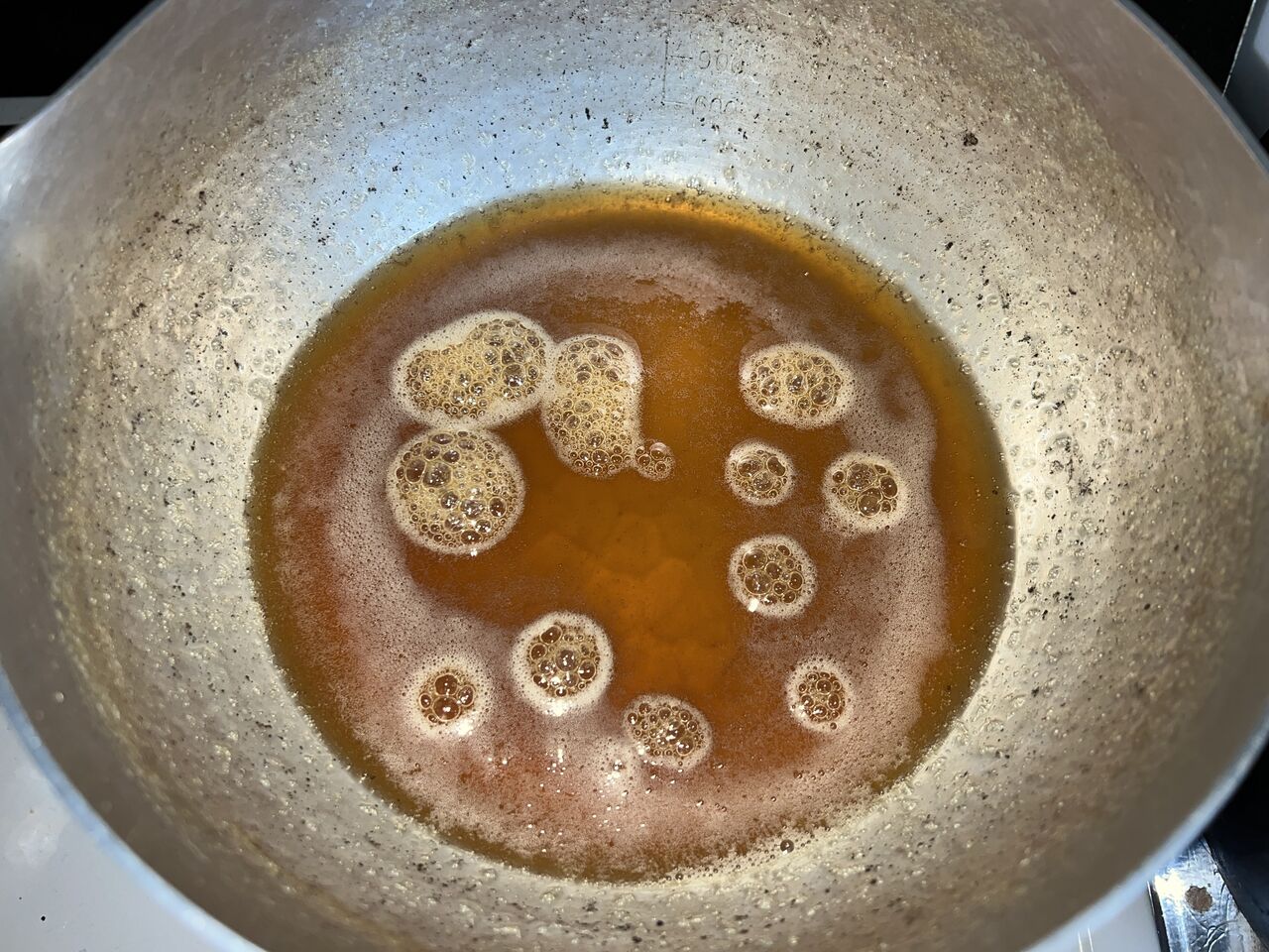グツグツやったら焦げるのでダメです。ポコポコ沸かせる感じ。